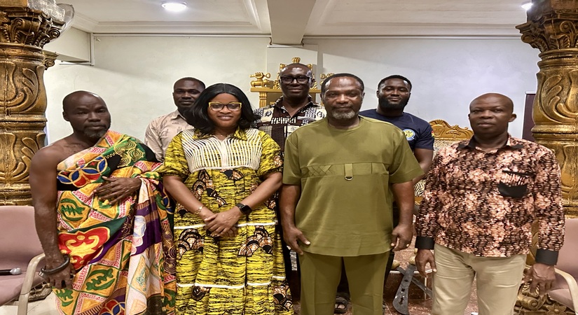 The District Chief Executive of Gomoa East, Hon. Margaret Naana Ackom, together with her Coordinating Director and Finance Officer, paid a respectful visit to Obrempong Nyanful Akrampah XI, the Paramount Chief of the Gomoa Ejumako Traditional Council. The delegation was received in a ceremonial setting adorned with golden pillars, symbolizing the rich cultural heritage of the area.